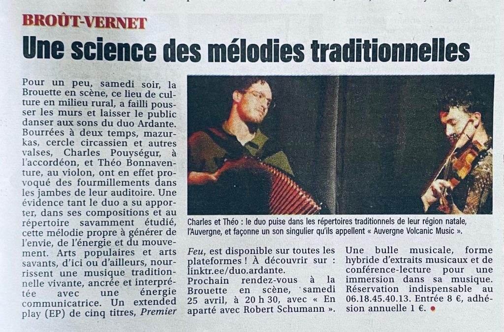 La presse écrit ... lisons la. La Montagne du 24 mars 2026 La Montagne du 20 novembre 2025 La montagne du 29 octobre 2025 Balade contée du 19 août 2025 Une résidence de quatre jours pour un duo - La Montagne du 04 mai 2025 Journal La Montagne du 11 avril 2024 Article La Montagne 09 octobre 2024 - photo Philippe RICHARD Journal La Montagne du 08 juin 2024 Artie ... une rencontre rare en terre bourbonnaise
